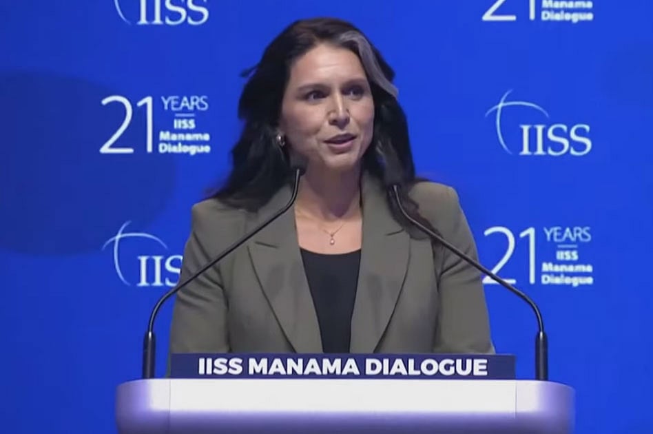 শুক্রবার (৩১ অক্টোবর) বাহরাইনে অনুষ্ঠিত বার্ষিক নিরাপত্তা সম্মেলন ‘মানামা সংলাপে’ তুলসী গ্যাবার্ড এসব কথা বলেন। আন্তর্জাতিক নিরাপত্তা গবেষণা সংস্থা ইন্টারন্যাশনাল ইনস্টিটিউট অব সিকিউরিটি স্টাডিজ (আইআইএসএস) এ সংলাপের আয়োজন করে।